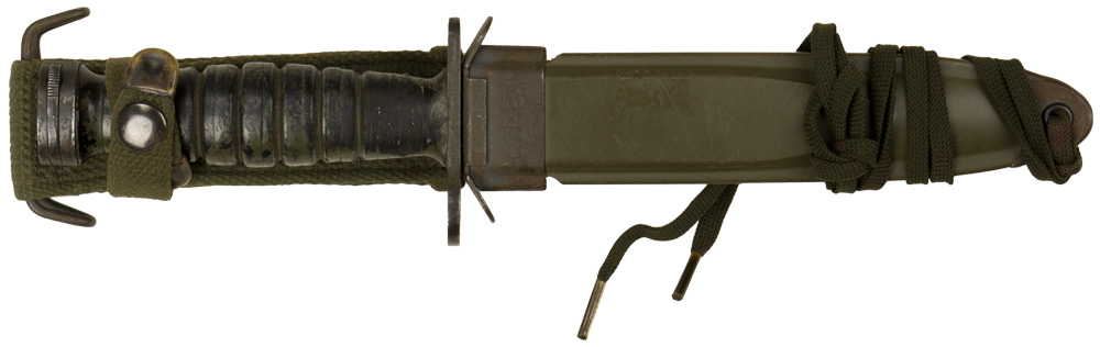 PHYSICAL DESCRIPTION: A blued fighting knife/bayonet and scabbard with an integral frog. The knife has a metal pommel with a locking mechanism. The unmarked blade measures approximately 17cm in length. Its horizontally ribbed, brown leather grip is age darkened as expected. Its blued metal double cross guard has a muzzle ring to its upper extension. The 19cm scabbard has a metal throat with downwardly-angled projections to either side, and to whose obverse is stamped "U.S. M8A1" and "PWH". A vertical projection extends from the back of the throat, to which the 14cm tall olive drab canvas frog is doubly riveted. The frog has a horizontal retaining strap riveted to the upper portion of its formed belt loop, with metal tips to either end of the strap and a brass snap button. At the very top of the frog is small loop with a shaped wire belt hook. The olive drab-colored bakelite scabbard itself tapers at its tip where there is a hole for a tie string. String is included.