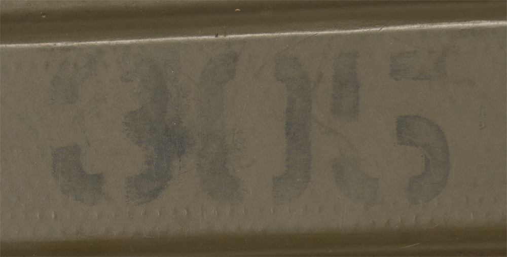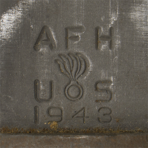 A blued bayonet with black bakelite grips and an olive drab metal and composite material scabbard. It has a 40.5cm, single-edged blade, with a swedge and long fullers. , To the reverse ricasso is stamped "A.F.H.", "U." and "S." flanking a circle ringed by another circle, with four waving lines radiating above it as well as a 1943 date. The blued cross guard has a muzzle ring to its upper extension, and a spring-loaded locking button to the lower side. Its horizontally ribbed bakelite grips are fixed by a counter sunk screw. Scabbard has a metal throat, with most of the olive drab paint missing, to the obverse of which is stamped "US" withing a flaming bomb. The top of the throat extends backwards and wraps around a metal wire belt hook. Short, hooked posts are to either side of the scabbard opening, which mate with the depressions to the cross guard, that to the left engaging the aforementioned locking button.