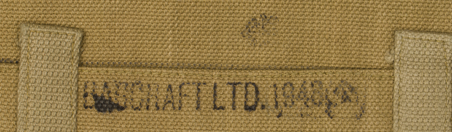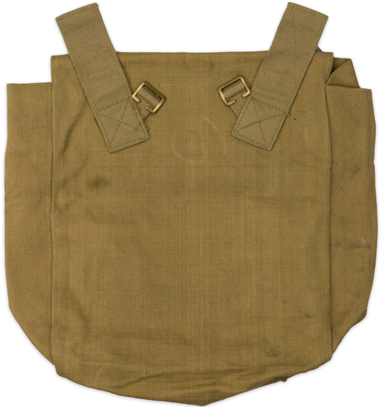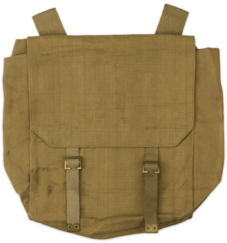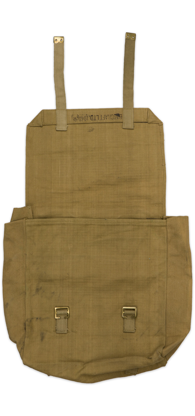 A 1937 pattern, large, tan/khaki, webbed canvas haversack with a single top fold-over flap. It is manufacture marked, dated (1943), and broad arrow marked.