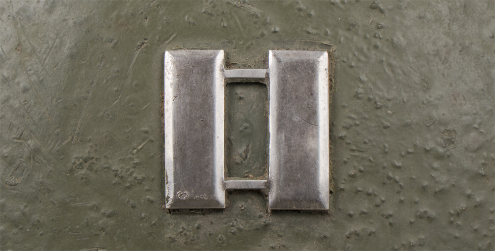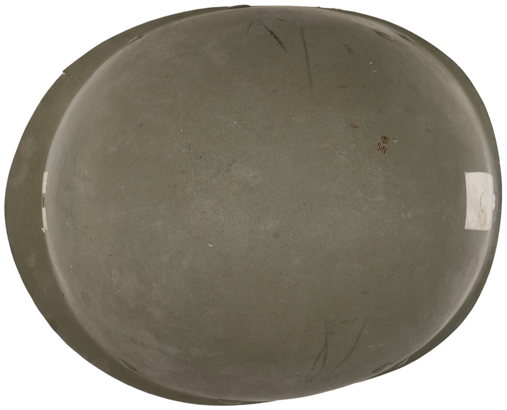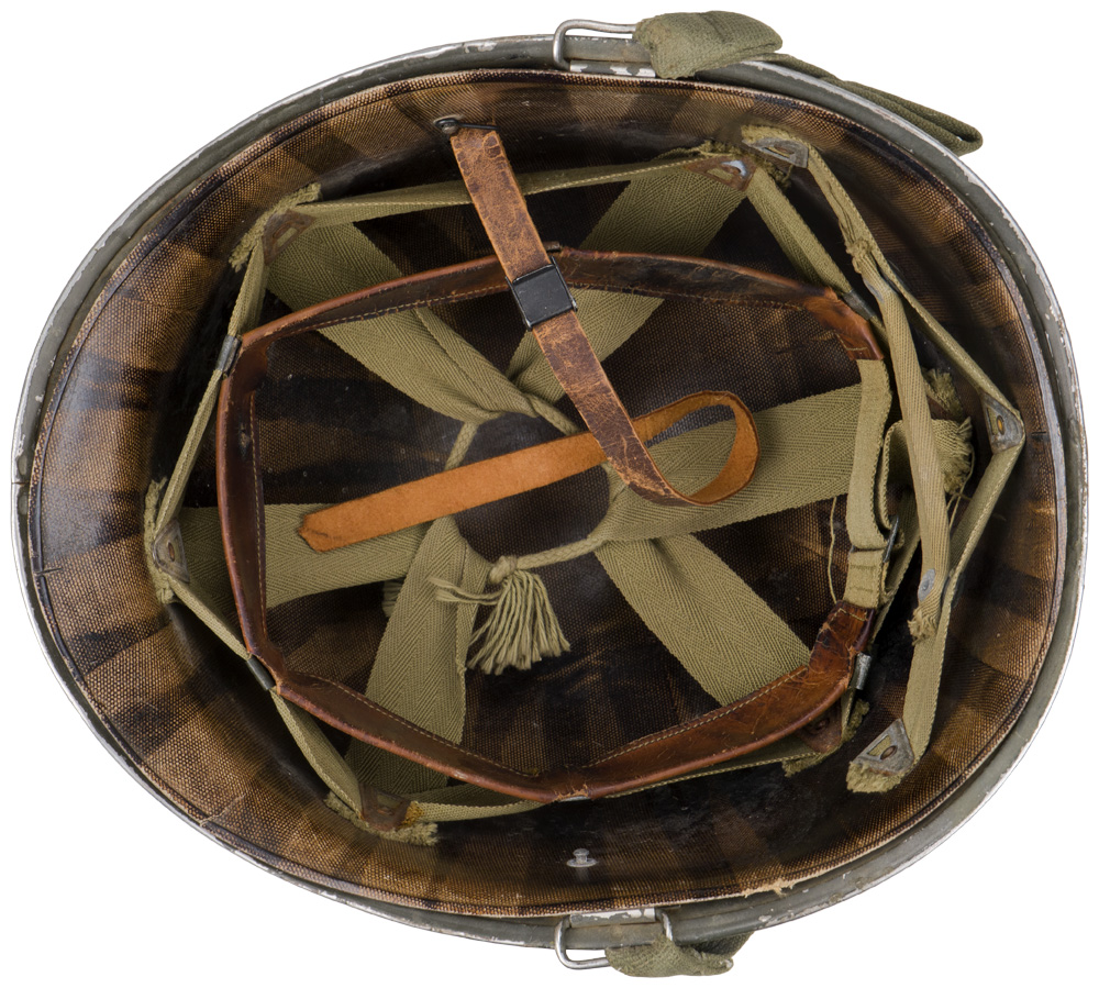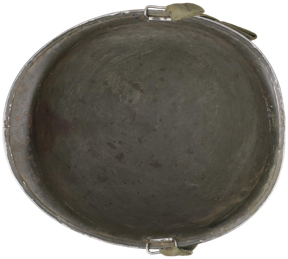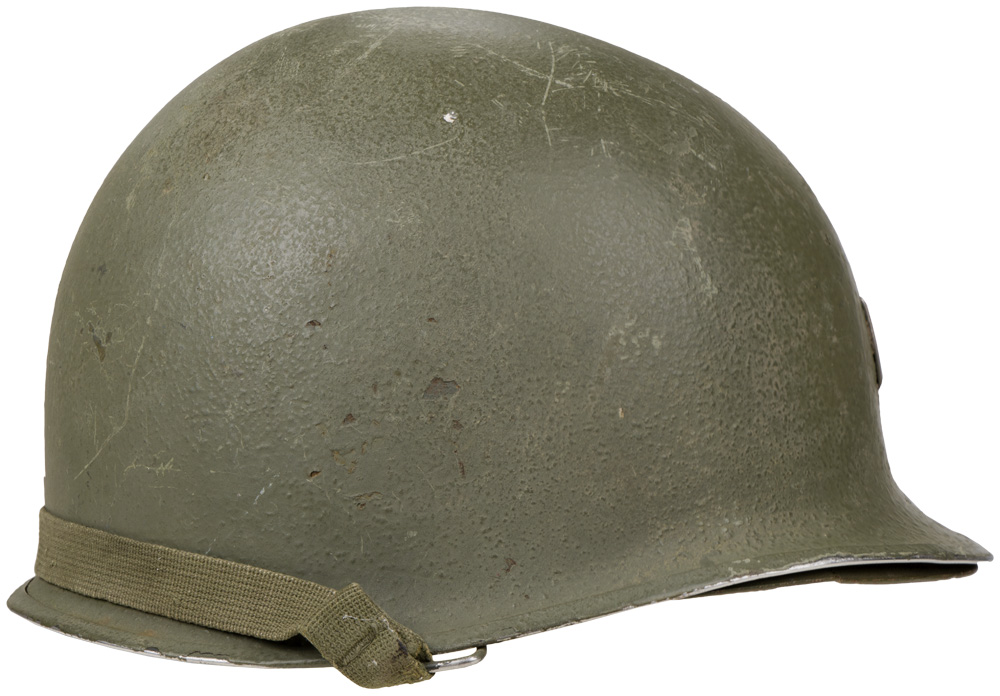 The M-1 helmet was developed as a replacement for the M-1917 helmet that had seen use since WW1. It was designed by using the crown of the M-1917, removing the brim and adding extensions to protect the neck, ears, and forehead. The resulting form was then used as a template for the production of a helmet body from a single piece of Hadfield Manganese Steel. The liner and suspension were developed after a modified Riddel Football helmet. The M-1 helmet was approved for production in June of 1941. Early models had solid loops (fixed bale) for the chin straps but they broke off to often and were replaced with a moveable hinged loop. The original rim of the helmet was made of stainless steel but it was found that the paint that was used would wear off to easily and leave a shiny reflective surface. To remedy this they switched to a Hadfield Manganese Steel and also changed the butt of the rim from the front to the rear of the helmet body. This change took place in October of 1944. The M-1 helmet had the best ballistic characteristics of any helmet developed up to then and could with stand the force from a 230 grain, .45 caliber bullet with a velocity of 800 feet per second.PHYSICAL DESCRIPTION: Front seam, swivel bale, Manganese shell. The shell retains most of its original paint with the expected wear. Decent separate liner. Nice complete liner and chinstrap system (one strap is torn). Both the shell and liner have Captain's rank insignia.