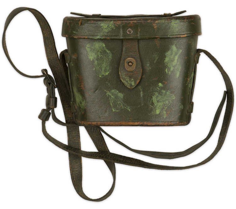 A hand painted camouflage binocular carrying case with lift the dot tab, carrying handle and adjustable strap. The front, under the lid, is embossed "D44160". This case would have held the M3 6x30 binoculars.