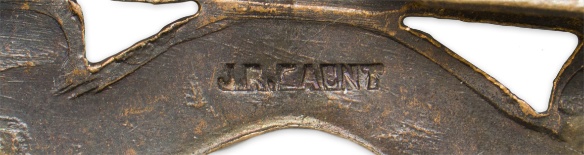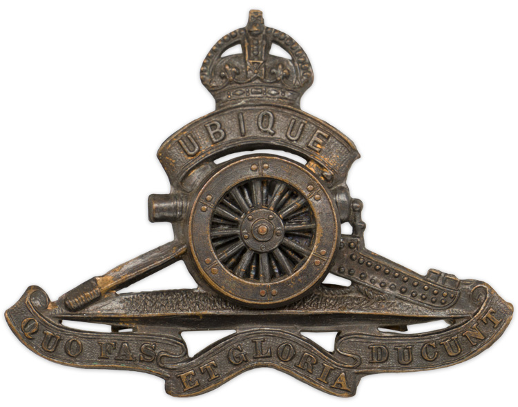 PHYSICAL BACKGROUND: A 7cm x 5cm, triangular shaped brass badge with cannon and a spinning wheel with "Ubique" and "Quo Fas et Gloria Ducunt" both printed on scrolls at the top and bottom. A Kings Crown is located at the top of the badge. Complete with dual blades. Marked "J.R. Gaunt" to the reverse.