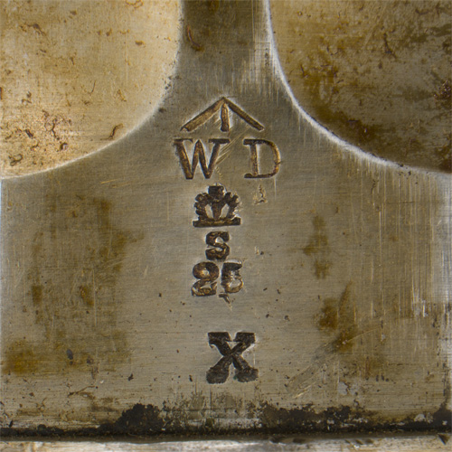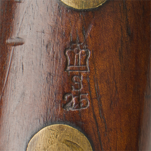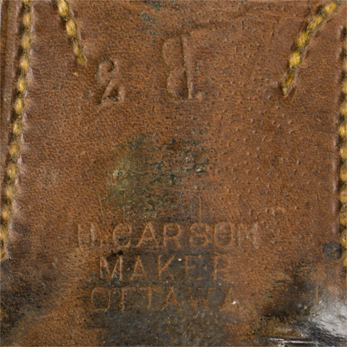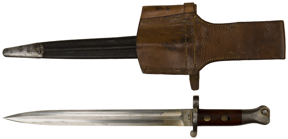 A pattern 1888 bayonet with leather Oliver pattern frog. The unsheathed bayonet has an overall length of 42.5cm with a 30.5cm long blade. Its contoured bird’s head pommel has a stud guide that is marked "6DCOR" for the 6th Regiment Duke of Connaught’s Own Rifle. The age-darkened, scratched and lightly pitted, contoured wooden grips are fixed with two large rivets and a cleaning hole drilled through it. The contoured metal cross guard has a circular muzzle guide to its upper extension. Its blade has wide fullers extending most of its length. To the ricasso is stamped the War Department acceptance mark used by the British government, bending mark and a Crown over "S" that is the Soligen maker mark. The reverse ricasso is stamped "Sanderson Scheffield". The blade is bright with light surface spotting. The Mk l scabbard, which is 32cm long, is comprised of thick, blackened leather, whose vertical seam is to its reverse, with contoured metal fittings to its top and bottom. The fitting to the top has a staple securing its mouthpiece, to the body of the scabbard, to both the obverse and reverse. An oval lug is to its obverse center. The bottom fitting also has securing staples, but near its scalloped top, obverse and reverse, and it tapers to its rounded base. This fitting is loose. The leather body of the scabbard shows light scratching & chafing. The frog stud is marked "582". The brown leather frog is maker marked to "H. Carson Maker Ottawa".