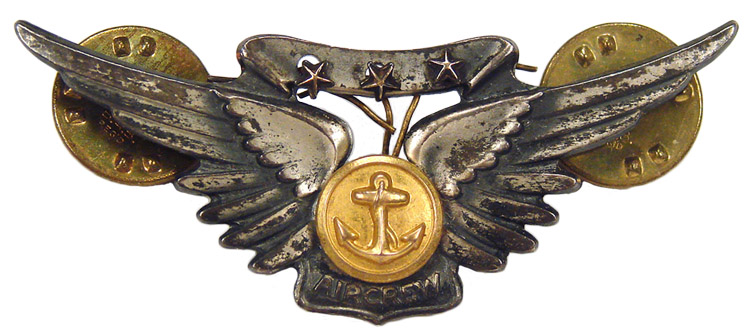 A two piece sterling pair of wings measuring approximately 2cm x 5cm with a central gilted emblem of a fouled anchor with "Air Crew" below. Surmounting the wings is a ribbon with three five pointed stars which are attached by fine pieces of wire that are inserted through corresponding holes and folded at the reverse to keep in place. Two pinch clasps are to the reverse which is flat and is inscribed "Gemsco N.Y." and "Sterling." The badge shows heavy wear and age, but overall a very nice, fully intact piece.