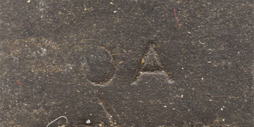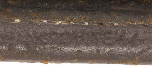 A 29.5cm long, scabbard is comprised of thick leather, whose vertical seam is to its reverse, with contoured metal fittings to its top and bottom. The fitting to the top has three rivets near and securing its mouthpiece, and, near its base, a staple fixing it to the body of the scabbard, obverse and reverse. An oval lug is to its obverse center. The bottom fitting also has securing staples, but near its scalloped top, obverse and reverse, and it tapers to its rounded base. The rear of the scabbard, along its seam is embossed "Manghovite ‘44", while the rounded base is embossed "OA".