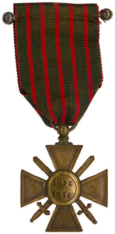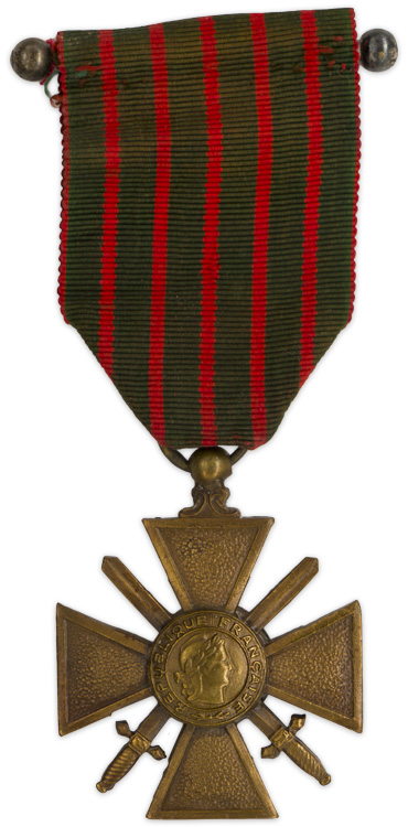 PHYSICAL DESCRIPTION: The bronze medal is in the form of cross Pattée, with crossed swords between the arms of a convex medallion to the center. To the front, the medallion is embossed the profiled head of a laurel-wearing woman, with "Republique Française" to the perimeter. To the reverse medallion are the dates "1914" and "1918." Through the pierced ball to the top of its uppermost arm passes the ring for its ribbon. It has a ribbon, which is green moire with five, vertical, narrow red stripes, and edged in red. The ribbon is folded over and stitched to itself to form a tunnel loop though which a suspension bar, a tube and pin with ball ends, has been threaded.