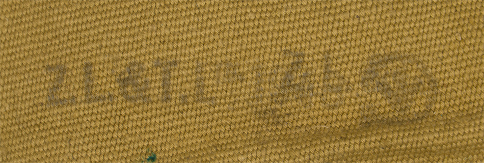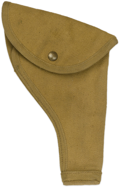 PHYSICAL DESCRIPTION: A standard issue tan/khaki web holster for pistol or revolver with brass fittings. The tan-colored, webbed canvas holster is about 25cm tall and 19cm wide along its top, tapering to 6cm at its reinforced base. It has a fold over top flap with brass snap closure. The edges are reinforced with additional stitched on webbing. There is a brass drainage grommet to bottom. Sewn to the reverse is a piece of webbing about 6.5cm x 9.5cm folded over on three sides to create loops through which three, brown painted, brass belt hooks have been inserted. Stamped in black ink to the interior top flap is a faint manufacturers mark of "Z.L. & T. Ltd." with a faint "C broad arrow", indicating it was issued through the Canadian Quartermasters Office. Nice example. Unable to discern date issued.