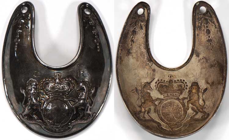 A sheffield plate gorget with rolled edge showing the coat of arms of King George III to the center. A hole is present to each end to allow for the attachment of ribbon or chain. The reverse is hollow showing a mirror image of the front. The metal has darkened with age with some surface scratches and overall wear to the coat of arms design. There is a slight inward bend to the left "arm".GRADE *** 3/4 PRICE $1,785.00
