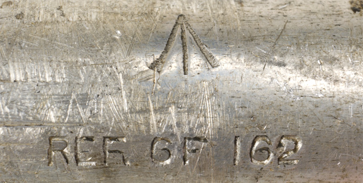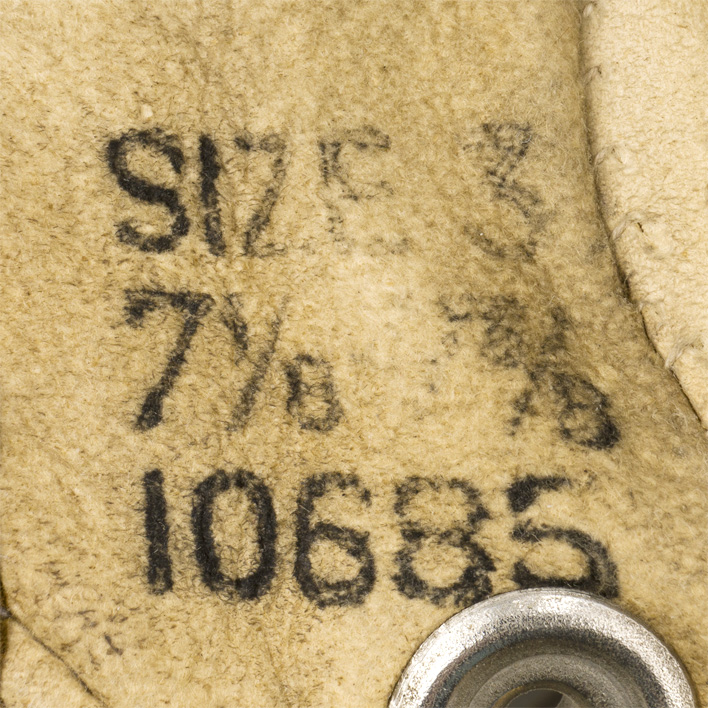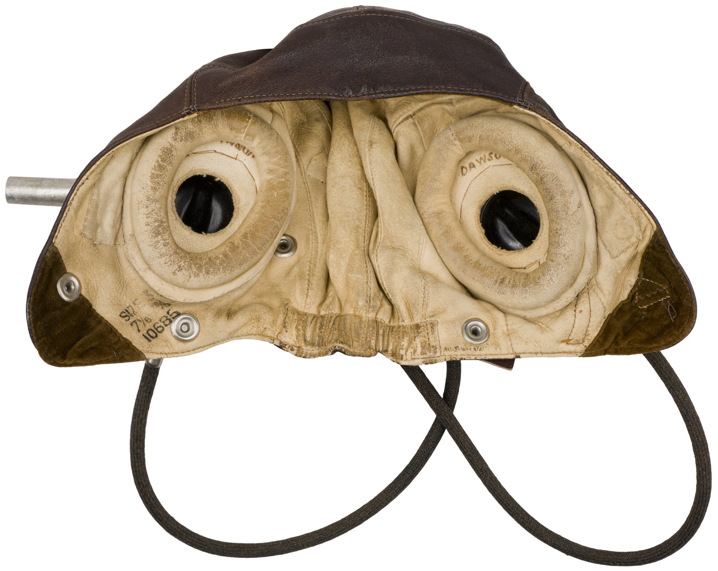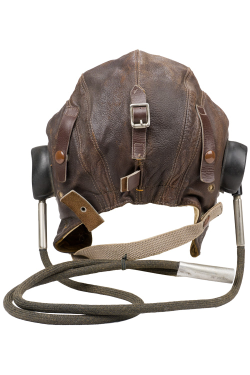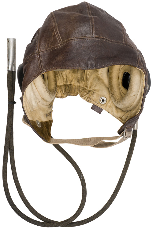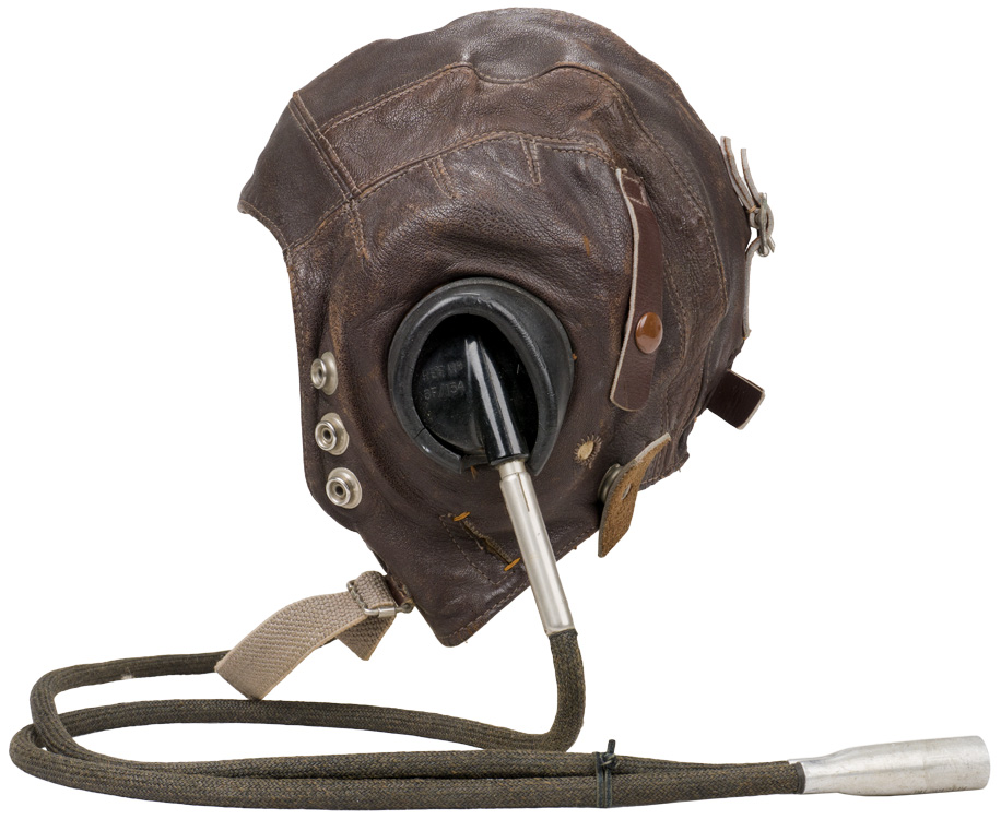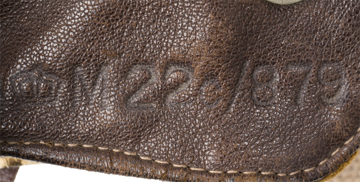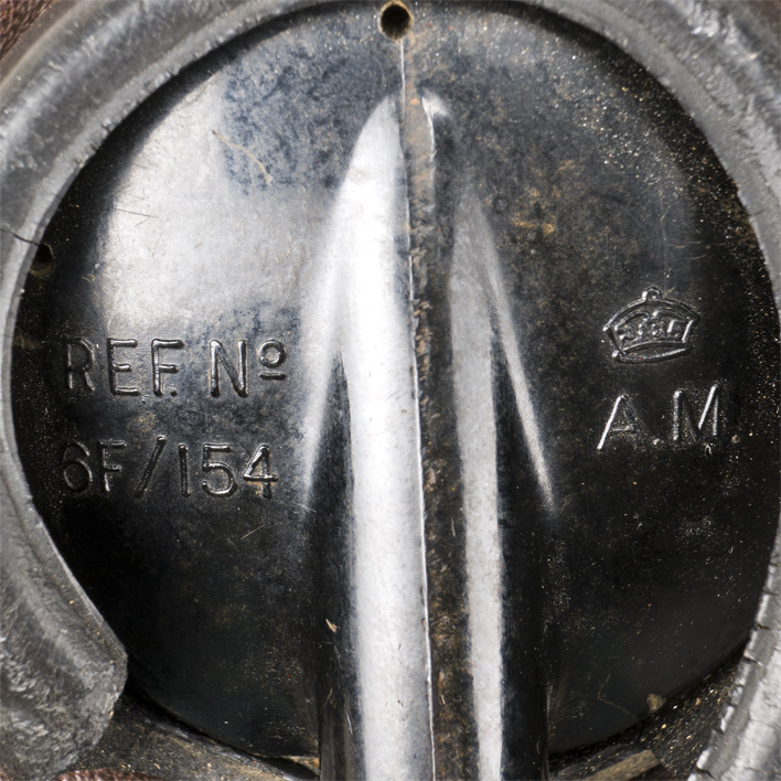 A type "C", second pattern that was introduced in 1944. The helmet made with a soft brown chromed leather exterior and a chamois lined interior with grey elastic chin strap. . To each ear cup is inserted a Gosport bakelite ear pieces and tubes that are marked "6F/154" as well as being Air Ministry marked. To the interior is stamped "Size 3, 7 1/8-3/8, 10685", as well as the handwritten name "Dawson." Embossed to the leather on the outside is an Air Ministry marking, "22C/879."