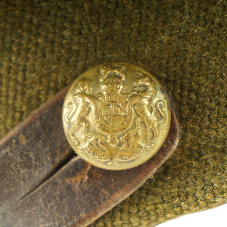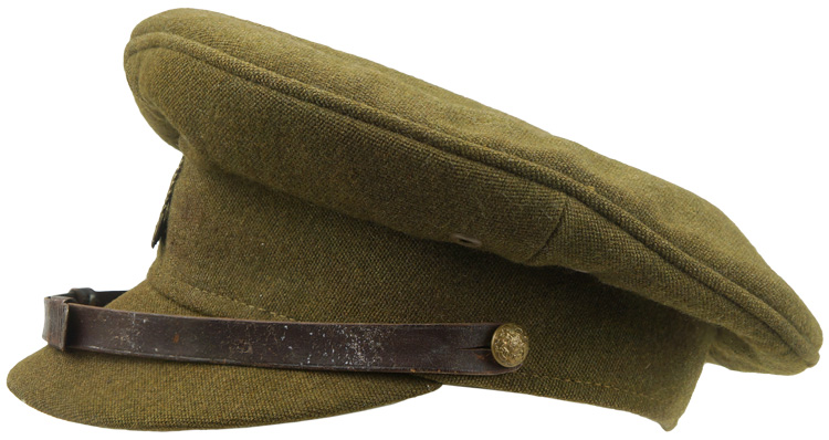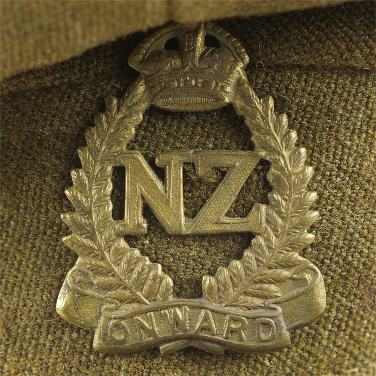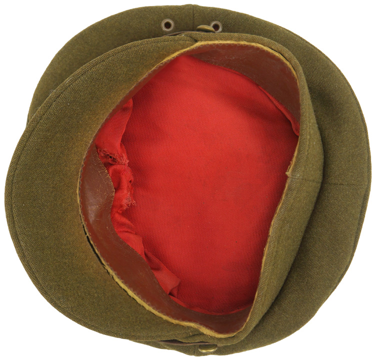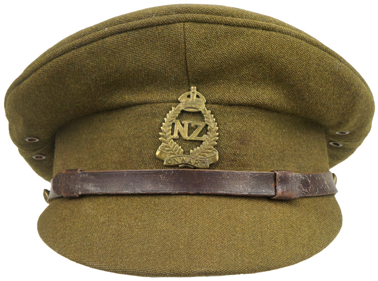 Khaki wool constriction officer's visor cap. A pair of grommets are to each side under the crown. A brown leather chinstrap is attached via a pair of small brass British General Service buttons and can be adjusted by two sliding loops. A brass New Zealand cap badge is attached via lugs and cotter pin. The interior is lined in rayon with a brown leather sweatband. Cap is roughly a size 54.