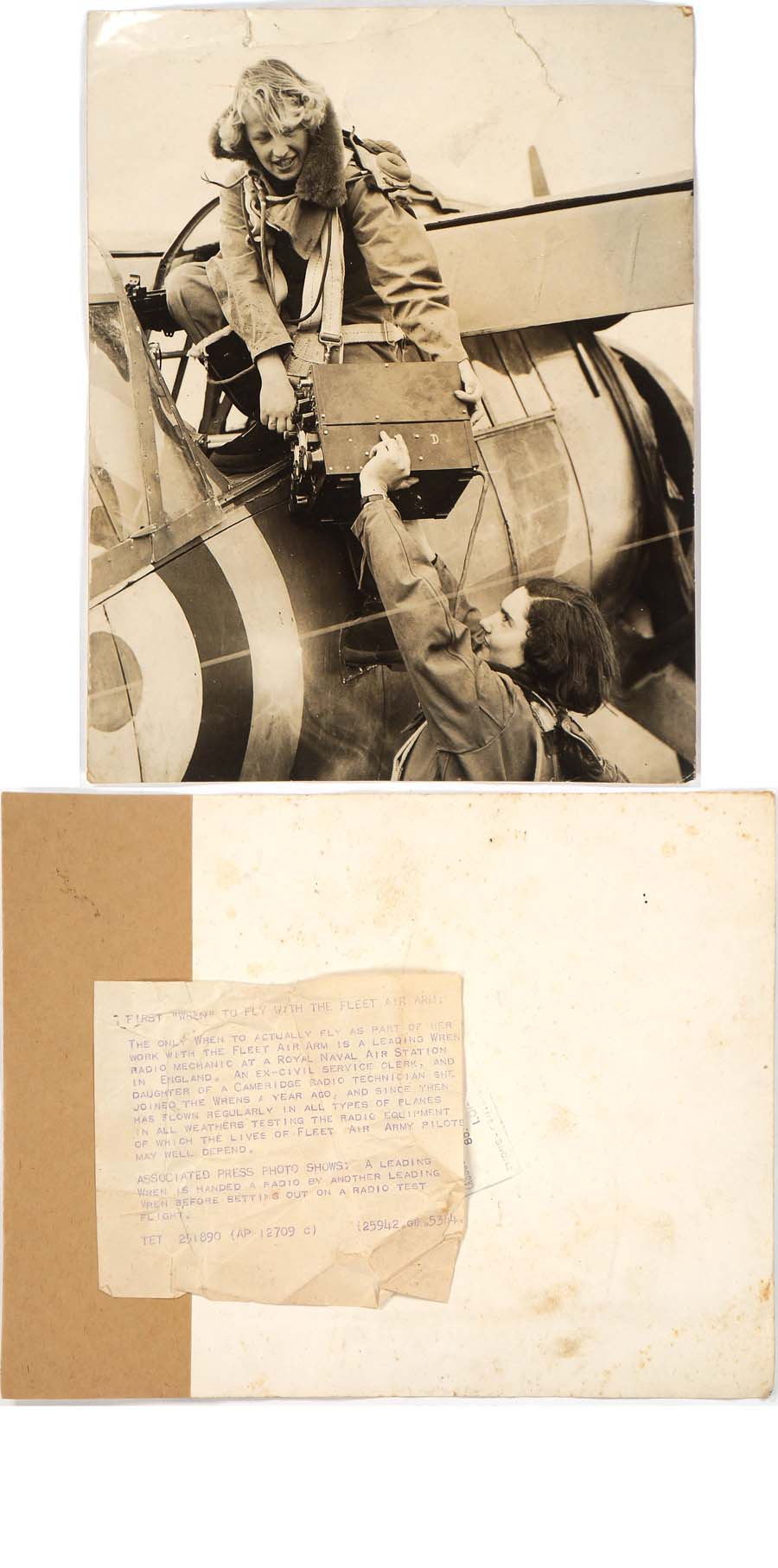 A 20.5cm x 26cm, black and white photograph that has a typewritten section of paper glued to the reverse along with a stamp for the "Associated Press". The caption for the photograph is "First "Wren" to Fly with the Fleet Air Arm".GRADE **** PRICE $44.00 (Or Best Offer)
