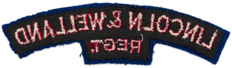 The roots of this regiment can be traced back to 1777, but it was not until 1936 that the two units were reorganized. This blue, melton wool flash measures 12cm x 3.5cm with red thread forming "Lincoln & Welland Regt." to the center. Appears to have been removed from a uniform.