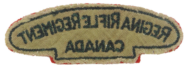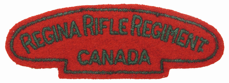 PHYSICAL DESCRIPTION: This machine embroidered red wool shoulder flash is stitched in drab green thread which is approximately 10cm x 3.5cm. "Regina Rifle Regiment" is arched slightly downward with "Canada" centered underneath. It has been removed from a uniform with the original backing in tact.