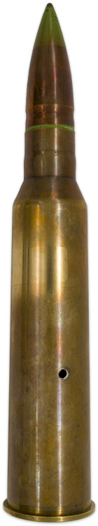 25x193.5mm R Hotchkiss Armor-Piercing Tracer (green tip) shell manufactured by Manufacture de Machines du Haut-Rhin in 1937. Used in SA Mle. 1934, 1935, 1937 & AC Mle. 1934 anti-tank guns (2,5cm Pak. 112[f], 2,5cm Kwk. 121[f], & 2,5cm Pak. 113[f] respectively in German service).