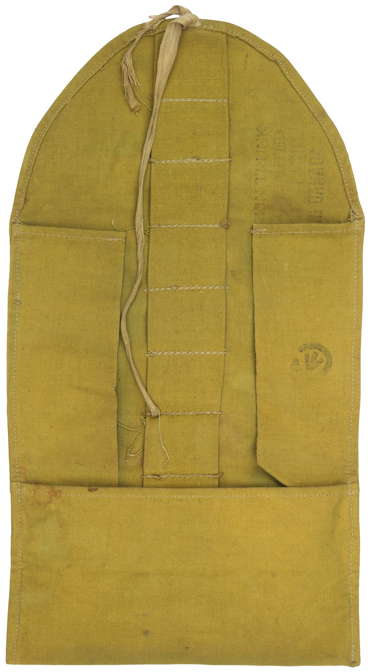 A khaki pouch measuring approximately 43cm x 17cm when fully opened. To the interior are loops that hold various personal items secure i.e. razor, comb, etc. No contents included. The interior is "C" broad arrow stamped, as well as, manufacture marked. The rolled kit measures approximately 23.5cm x 17cm.