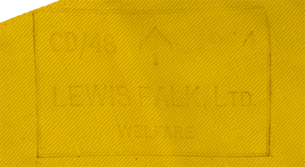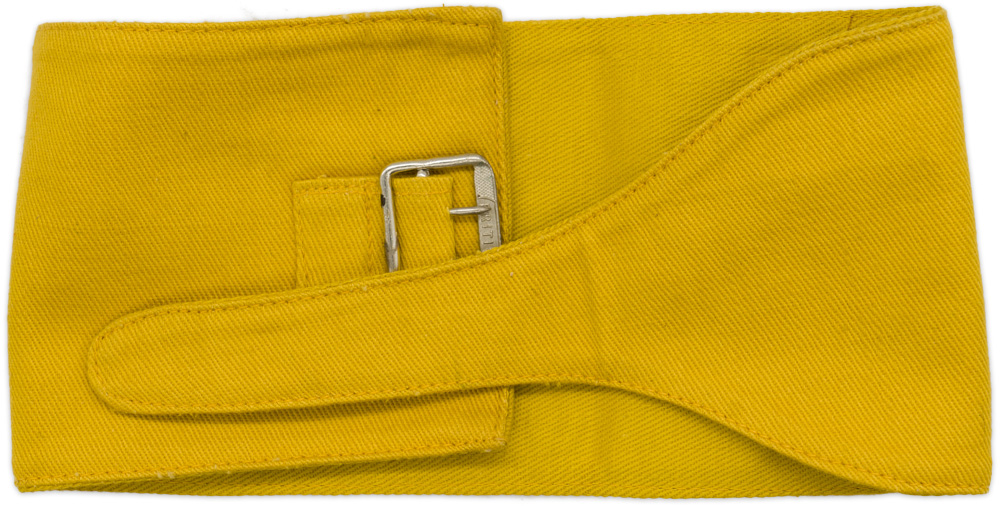 A yellow, machine embroidered arm band with strap and corresponding single prong buckle. The arm band measures approximately 9cm x 45.5cm in length.