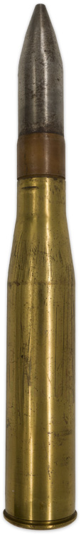 1.1-inch .75-caliber (28x199mmSR) Mark I shell manufactured by Chase Brass & Copper Co. (Waterbury, Connecticut) in 1941. Used in 1.1-inch .75-caliber anti-aircraft guns on U.S. Navy ships.