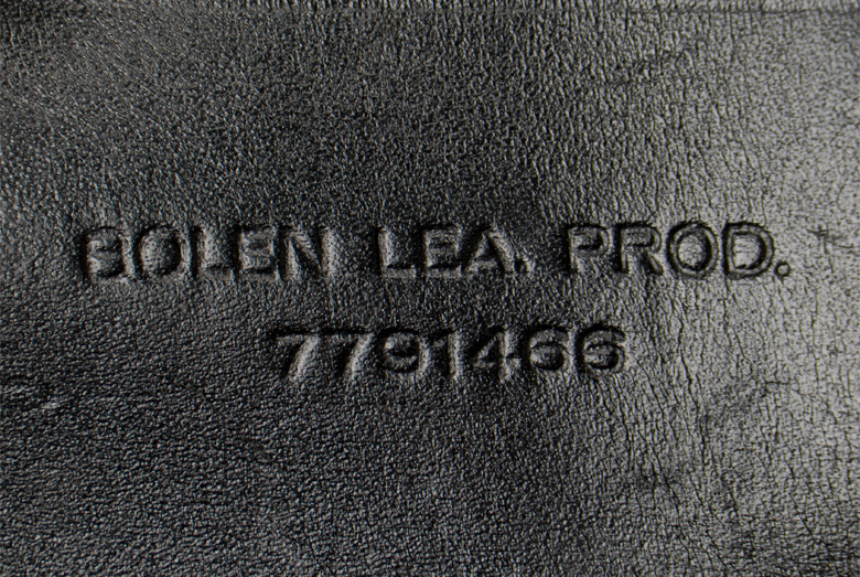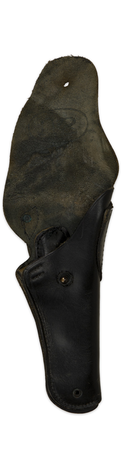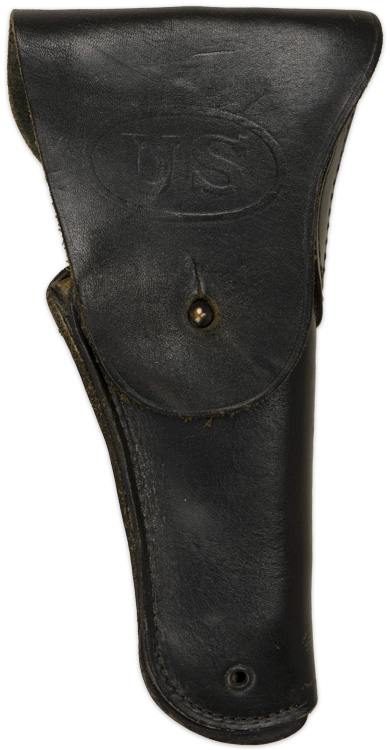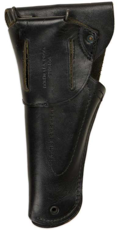 A black leather holster with brass fittings has a top fold over flap has "US" within a horizontal oval embossed to it and single stud hole. Both the front and reverse base of the holster body has a brass ventilation grommet. The reverse features a riveted leather section with two vertical slashes to draw a belt through, surmounted by a brass hook for the same purpose. Between the vertical slashes is impressed " Bolen Lea Prod. 7791466" which was used 1963 64. The interior of the holster has a built up section, evidently for positioning the pistol more securely. All of the stitching is intact.