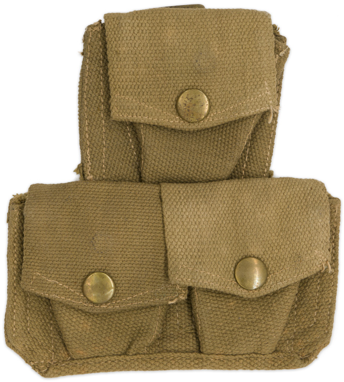 A tan/khaki webbed canvas triple pocket ammo pouch with brass fittings. Each pocket's top fold-over flap has a single brass snap closure which mates with one of two brass studs to each pouch front. Complete with all original brass closing snaps. To the reverse, on either side, are vertical brass belt hooks with, between them to the top, a vertical strap with a brass loop and another short strap with a brass buckle. Unmarked. Of Note: Each pocket holds two five round .303 stripper clips (10 rounds per pocket).