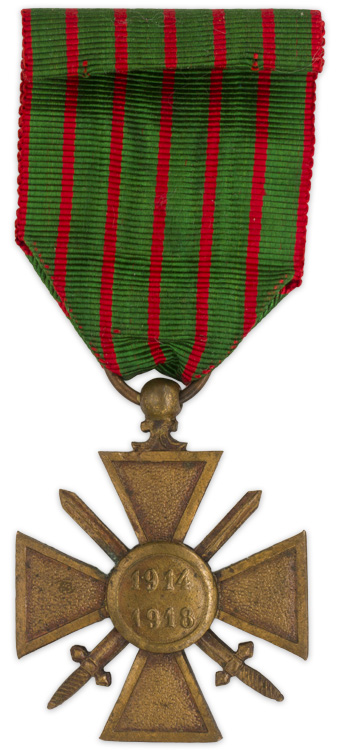 PHYSICAL DESCRIPTION: The bronze medal is in the form of cross Pattée, with crossed swords between the arms of a convex medallion to the center. To the front, the medallion is embossed the profiled head of a laurel-wearing woman, with "Republique Française" to the perimeter. To the reverse medallion are the dates "1914" and "1918." Through the pierced ball to the top of its uppermost arm passes the ring for its ribbon. It has a ribbon, which is green moire with five, vertical, narrow red stripes, and edged in red. The ribbon is folded over and stitched to itself to form a tunnel loop though which a suspension bar, a tube and pin with ball ends, has been threaded. Attached is a bronze (regiment or brigade) star. The ribbon is still nicely vibrant, while the medal has darkened with age, which brings out the highlights of the medal. A nice example.