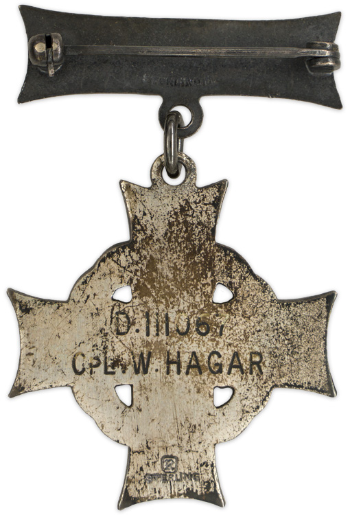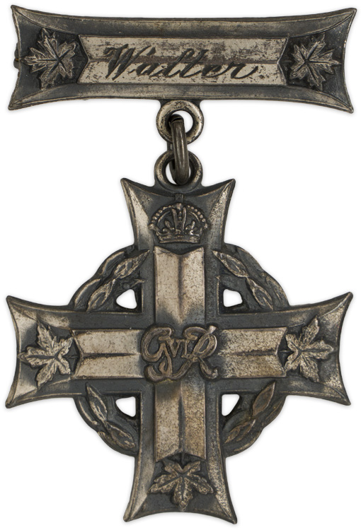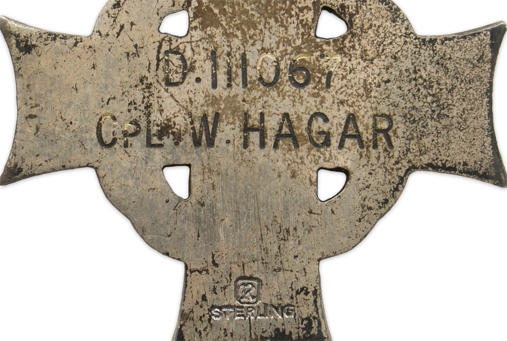 The silver Cross, which is 31mm x 31mm is suspended by a bar. At the top of the cross there is a relief of a crown, while at the foot, and at the center, it is framed by a wreath of laurel, the royal cipher "GVIR" Is engraved. Maple leafs are to three arms of the cross. The number, rank and name of the soldiers commemorated is engraved on the back of the cross "D.111067, Cpl. W. Hagar". The reverse is also marked "Sterling" . The front of the bar is engraved with the name "Walter" while the reverse is marked "Sterling." Of Note: Cpl. W. Hagar originally enlisted in 1915 at the age of 31 into the 38th Battalion. He passed on June 12,1945 at the age of 58 while serving with the Veterans Guard of Canada.