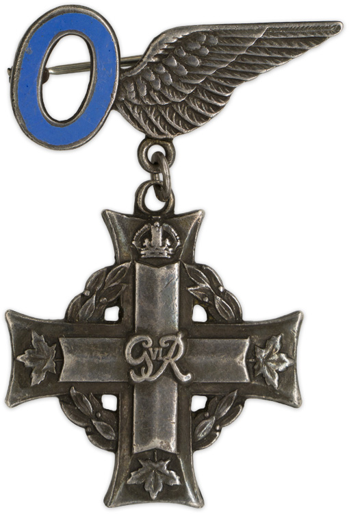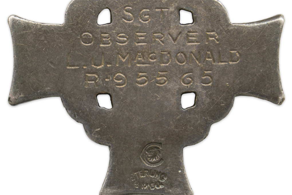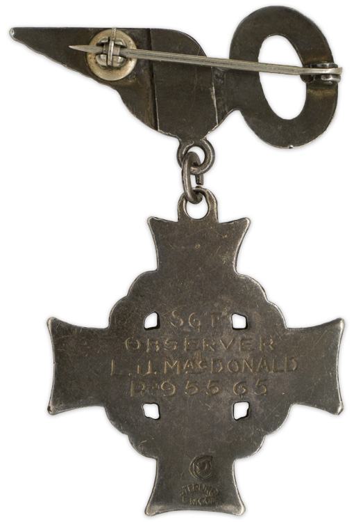 The silver Cross, which is 31mm x 31mm is suspended by a bar. At the top of the cross there is a relief of a crown, while at the foot, and at the center, it is framed by a wreath of laurel, the royal cipher "GVIR" Is engraved. Maple leafs are to three arms of the cross. The number, rank and name of the soldiers commemorated is engraved on the back of the cross "SGT. OBSERVER, L.J. MACDONALD R. 95565". The reverse is also marked "Sterling". The medal is suspended from an enamel and silver Observers winged badge with simple hinge pin to the reverse. Of Note: Sgt. Observer Louis John MacDonald died at the age of 21 on September 26, 1942 from cattarhal jaundice. He is laid to rest at Troqueer Cemetery, United Kingdom. He was originally from Ottawa Canada.
