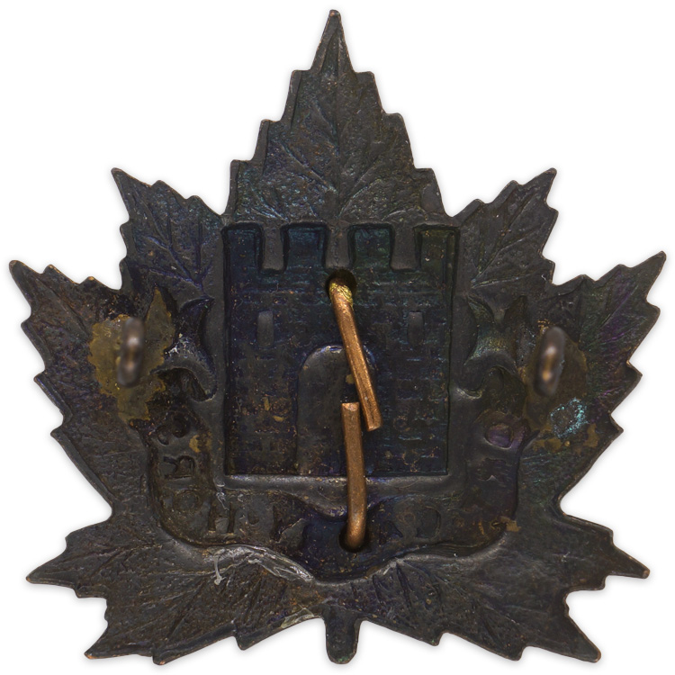 A two piece Officer’s badge featuring a brass maple leaf with "Fort Garry Horse" on a ribbon below a brick castle section. Two lugs are present on the back which is a mirror image of the front. It measures approximately 4.5cm x 4.5cm.