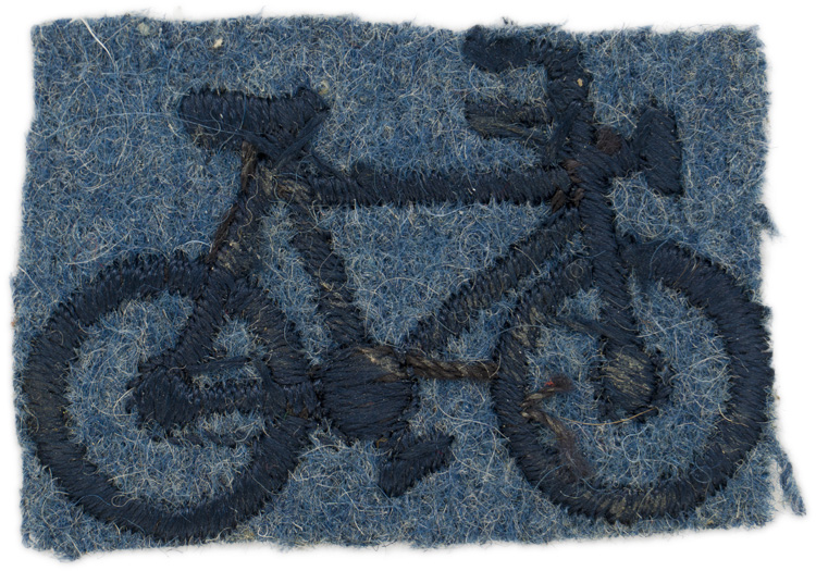 A machine embroidered badge showing the profile of a bicycle in black thread on a wool background that measures approximately 5cm x 3.5cm. Shows usage and wear.