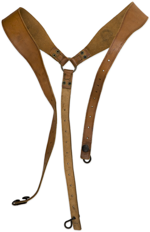 A set of brown leather "Y" straps with a circular ring painted black from which three leather straps extend from and are secured by rivets and thread. Originals and in nice condition. Complete as photographed.
