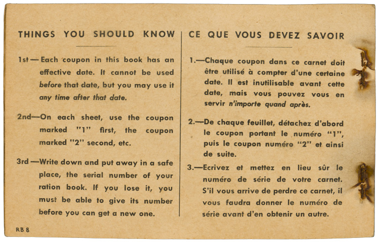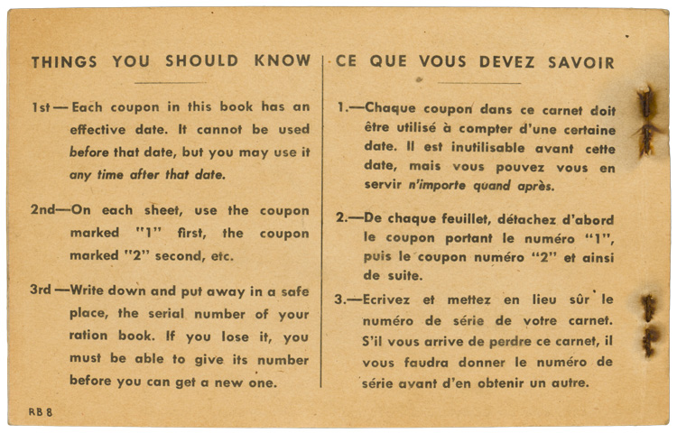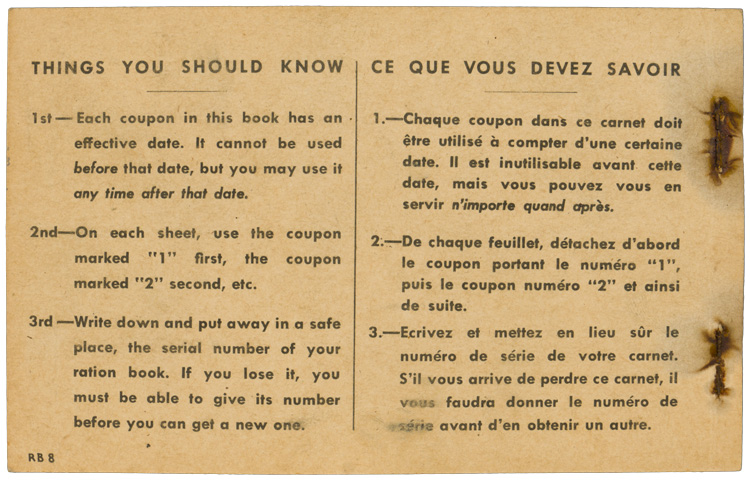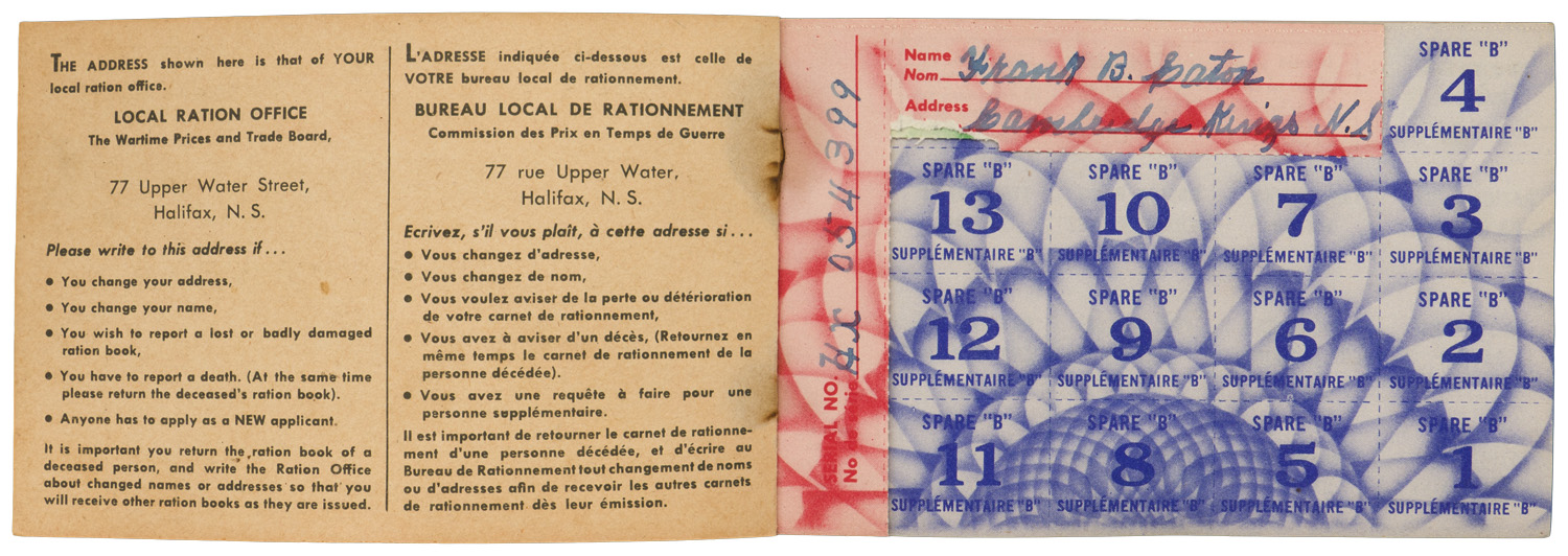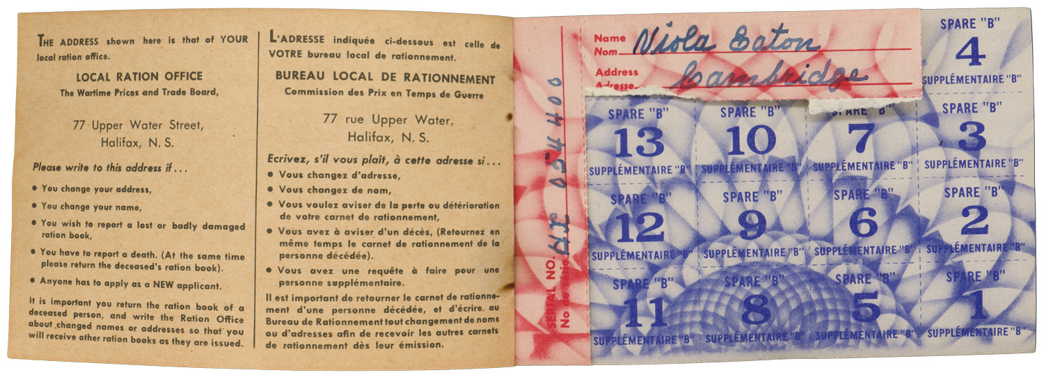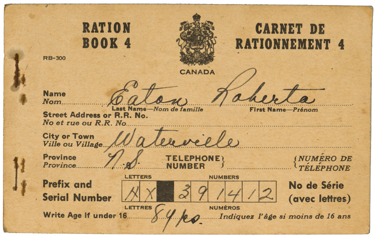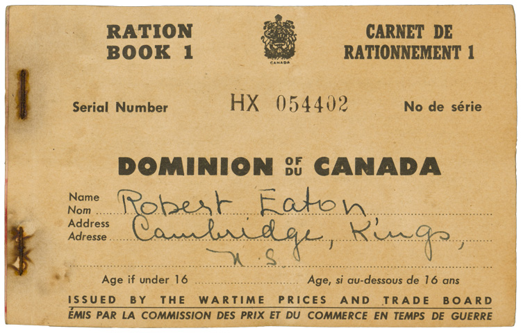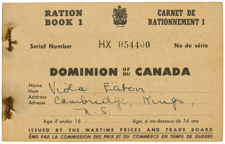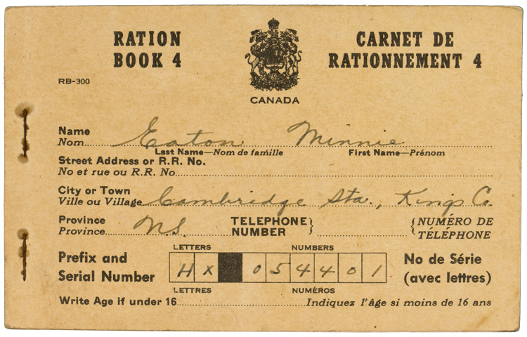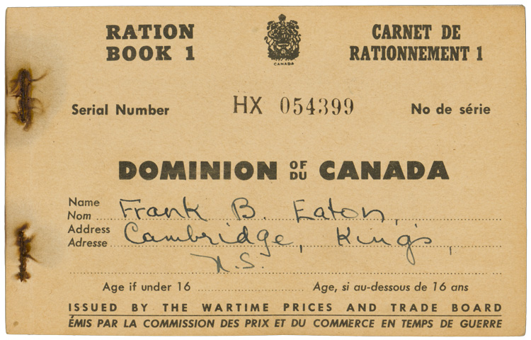 A grouping of four ration books belonging to various members of the Eaton family of "Cambridge Station, Kings County, Nova Scotia". Also included is an original envelope.