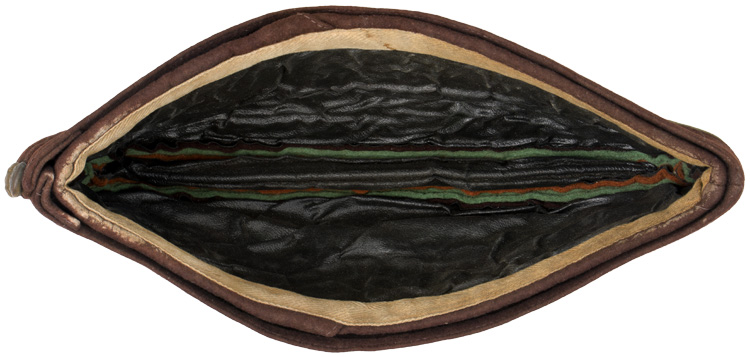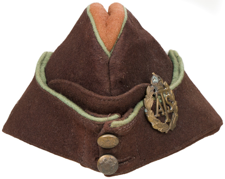 A dark russet brown wool forage cap with green trim and a apricot inset to the crown. A pair of British general list buttons are to the front, as well as an A.T.S. cap badge to the left side held in place via slider. The interior has a herring bone twill tape sweat band and a water proof liner that has hardened with time. Included is a pair of small black and white portrait photographs of the same woman.