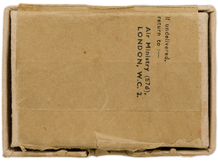 A two piece, heavy cardstock carton with address label and cancellation stamp. The carton measures approximately 2cm x 6.5cm x 9cm.