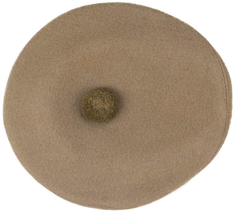 A soft tan wool bonnet comprised of a crown with a tan/brown coloured wool Touri (pom-pom) to its center, a body with seam and bow to the rear. The interior is lined in tan silk/rayon with a manufacture tag for Wm. Anderson & Sons. Ltd. Of Edinburgh. The size is approximately 52.