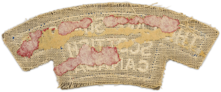 A two piece, machine embroidered "THE LAKE SUPERIOR SCOTTISH CANADA" in white thread onto a blue and grey wool backing. Shoulder flash measures approximately 12cm x 5cm.