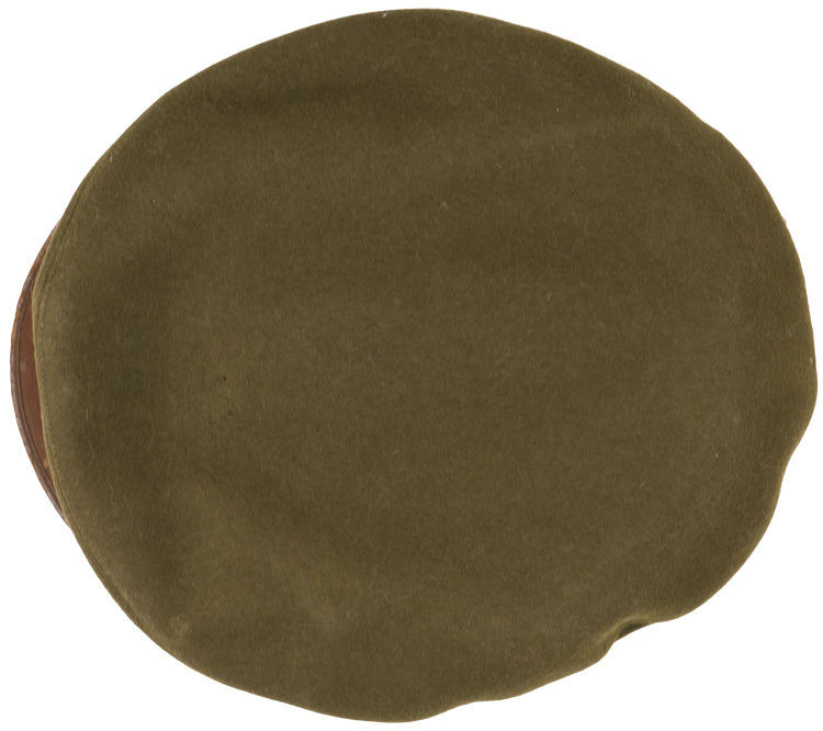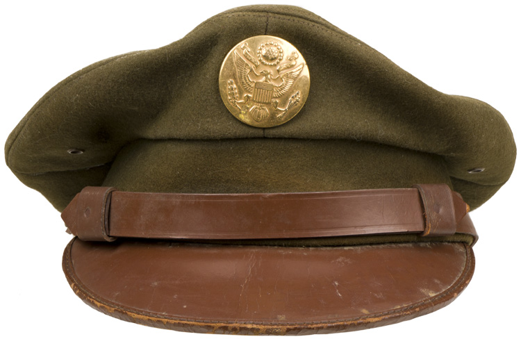 Olive drab wool top and centerband and leather visor. Enlisted cap badge is is die-struck alloy with a fire gilt finish. Badge takes the form of an American Eagle with stars and stripes on the shield that resides on the eagles chest. The eagles right claw holds laurel, while in the left claw, he holds a bundle of arrows. The scroll which is spread on the wings, has the United States Motto of, "E pluribus Unum." Which is Latin for, "Out of many, one." This is a direct reference to the thirteen colonies that are united as one nation. This motto was suggested by the first great sea committee in 1776. Above the scroll, there is a round cloud with 13 stars in the middle. Again it alludes to the union. Nice original chinstrap is complete with both brass buttons as well as the backstrap. The brass buttons also have the inscription of the United States coat of arms. Havana brown leather visor. Liner is complete. Sweatband has a vertical tear, but otherwise the cap shows typical wear and usage.