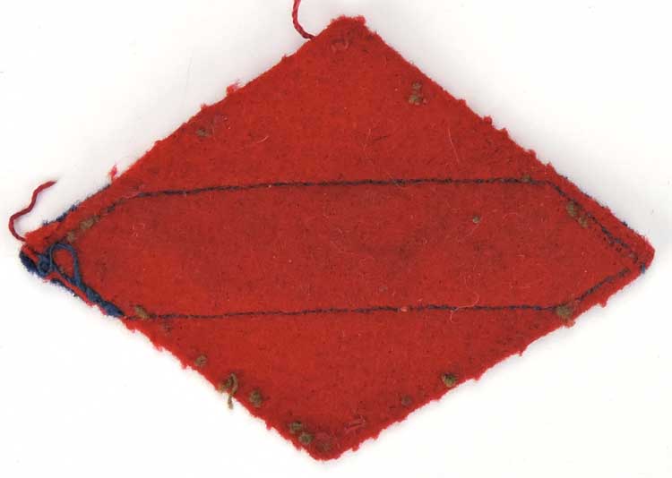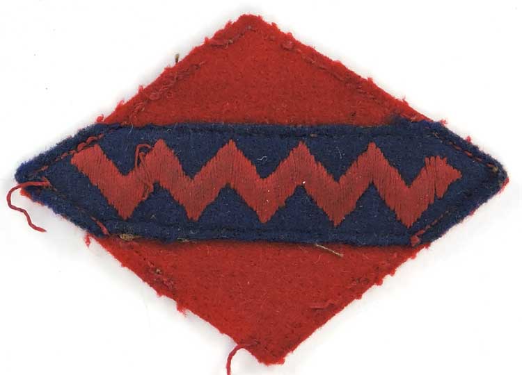 Every infantry or armored Division had its own insignia. The 1st Canadian Army Group Royal Artillery were part of the First Canadian Army.PHYSICAL DESCRIPTION: A diamond shaped formation patch consisting of a red felt background with a wide blue horizontal strip sewn across the center. Embroidered to the center of the blue strip is a red zig-zag to indicate Artillery. The colors stand for the 1st and 2nd corps which were the Army’s components. Removed from a uniform.