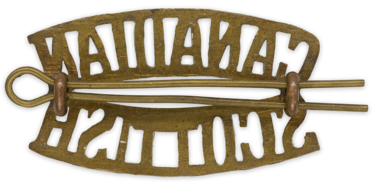 PHYSICAL DESCRIPTION: 1920's or 1930's vintage stamped brass shoulder tile measuring about 4cm x 2cm, with "CANADIAN" arched downward and "SCOTTISH" arched upward; meeting in the corners. The reverse is a mirror image of the front which has double mounting lugs and cotter pin.
