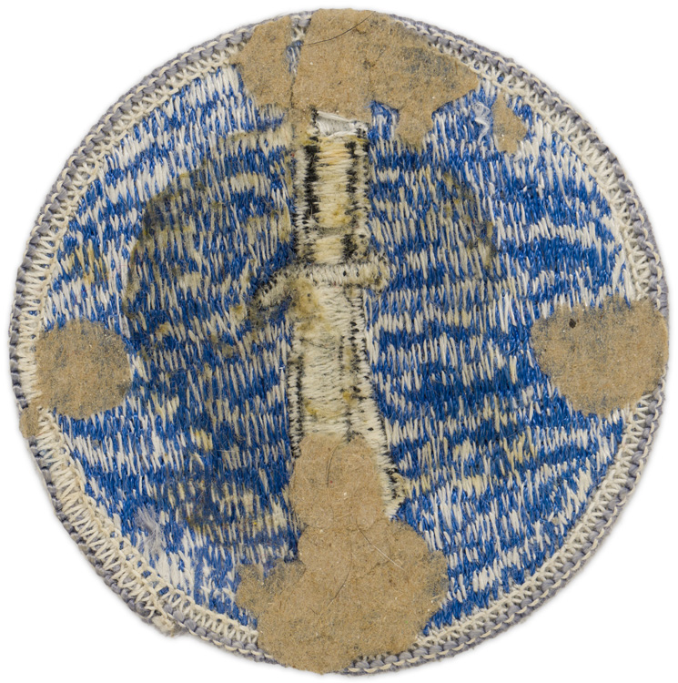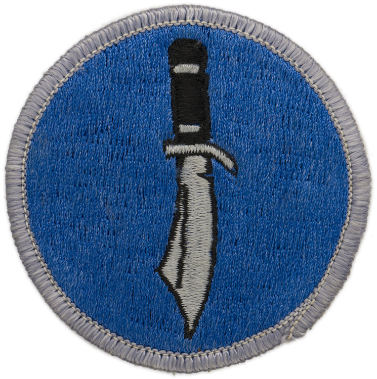PHYSICAL DESCRIPTION: A machine embroidered 65mm diameter patch with a black handled fighting knife to the center of a blue background. A white thread borders the patch.