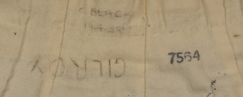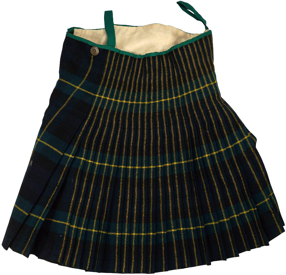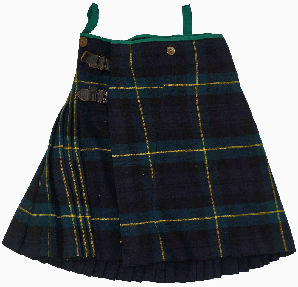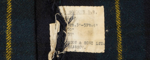 A box pleated wool kilt in the colours of the Gordon Highlander tartan that has two leather straps with double prong buckles, as well as three khaki green buttons along the waistband. A tag sewn to the interior states "No. 3 Gordons O.R. Size 4." "Length 5Ft. 3" - 5 Ft. 4", Waist 30" "Breech 37"." It also states the manufacture name of "Thomas Gordon & Sons Ltd. Glasgow." There is a hand stitched, diagonal seam to the front indicating a possible repair. Two green tapes are affixed to the waistband. The interior also have handwritten name "Gilroy", along with other markings. The wool appears to be in good condition, with some mothing to the white wool lining the waist.