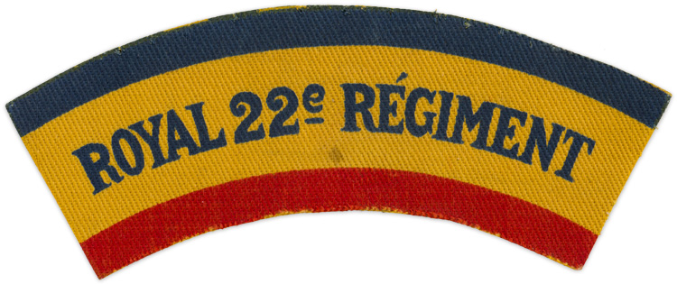 PHYSICAL DESCRIPTION: A canvas, tri colour flash of blue, yellow and red, with "Royal 22e Regiment" printed to the yellow section. Shoulder flash measures approximately 12.5cm x 4cm.