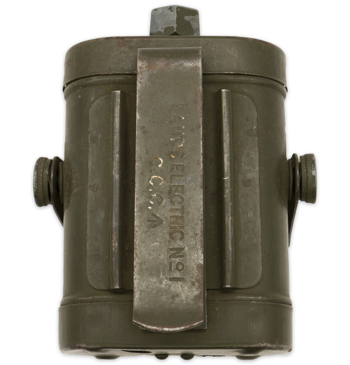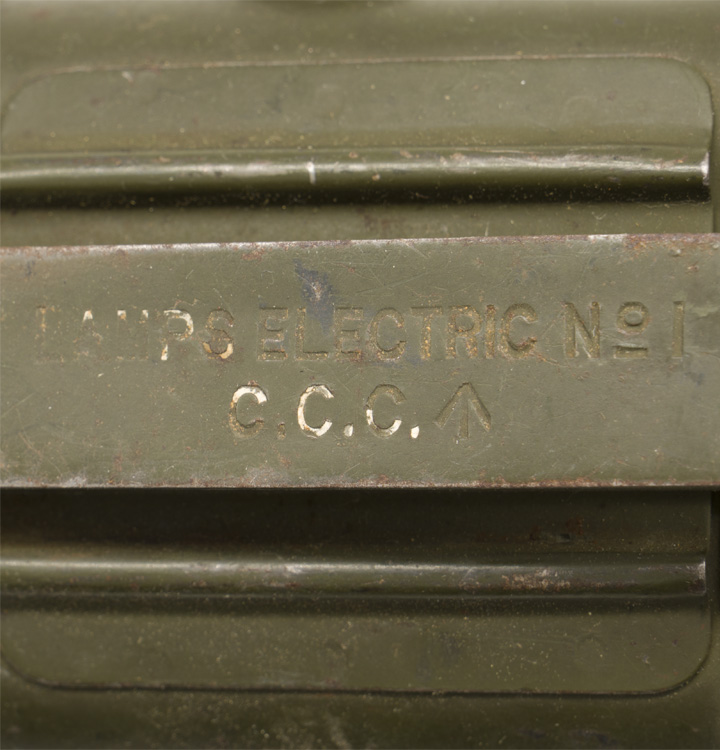 A metal alloy, green painted lamp with hinged handle, hinged blackout shade and bulb, is engraved onto the belt clip "Lamps Electric No. 1" "C.C.C." along with a broad arrow. Bulb is broken, handle is missing, no batteries or internal components. Good to complete a display.