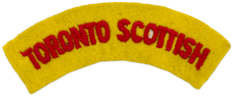 PHYSICAL DESCRIPTION: A yellow melton, machine embroidered flash measuring approximately 11cm x 2cm that has stitched in red thread "Toronto Scottish." A few holes are to the surface.