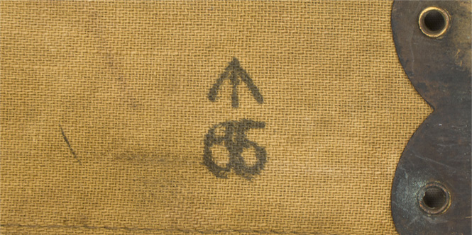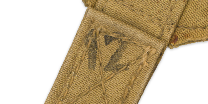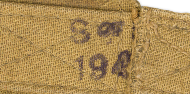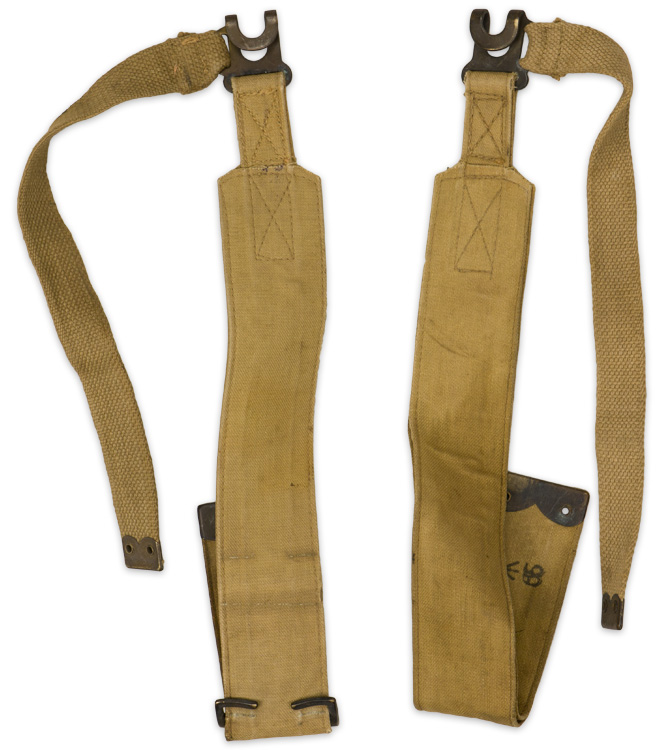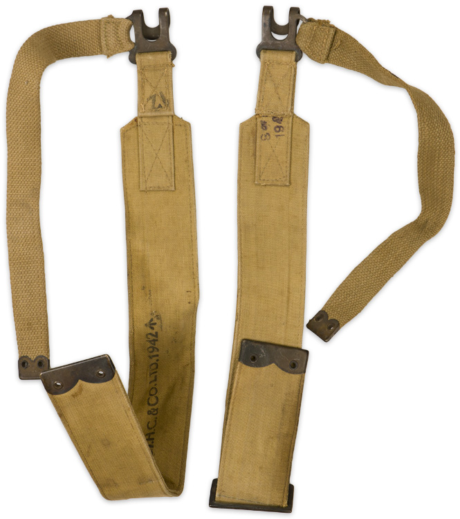 A pair of rubberized canvas "L" straps where used to attach the haversack (large pack) to the soldiers back. Each pack has two of these straps with the main strap measuring approximately 45cm x 5cm, while the webbed auxiliary strap measures approximately 34cm x 2.5cm. Complete with all brass fittings. Both straps are broad arrow marked, as well as being marked for "H.H.C. & Co. Ltd. 1942".