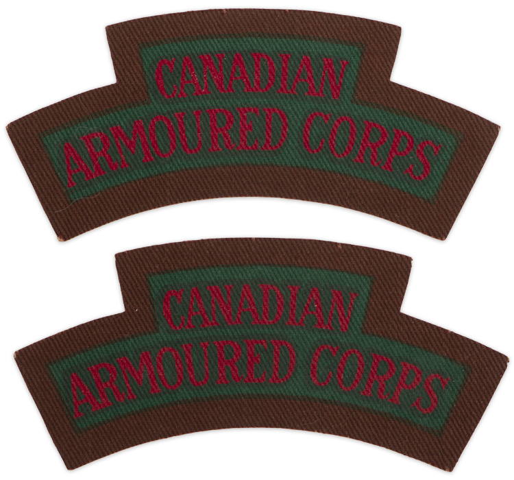 PHYSICAL DESCRIPTION: A pair of printed canvas insignia, has a brown background with a green center to which has been printed in red letters "Canadian" and "Armoured Corps".