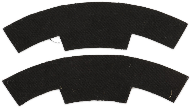 A pair of black canvas shoulder flashes with red printed lettering that reads "Canadian Provost Corps" that measure approximately 14cm x 3.5cm. Excellent example, un-issued condition.