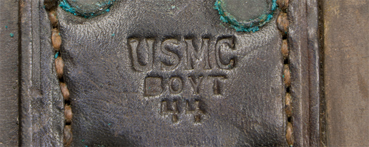 A 9.5cm x 31.5cm, metal and leather scabbard with metal hangers to the reverse. The reverse is clearly marked "USMC, Boyt 44".