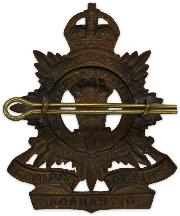 PHYSICAL DESCRIPTION: A stamped cap badge with "The Royal Regiment of Canada" to the banners to the bottom. There are three mottos surrounding the central plume design which read "Nec aspera terrent (And difficulties do not daunt), "honi soit qui mal y pense (Shame to he who thinks evil of it) and "Ready aye ready". A pair of prongs and cotter pin are to the reverse. The badge measures approximately 4.5cm x 5.5cm with a slight backward bend to the badge.
