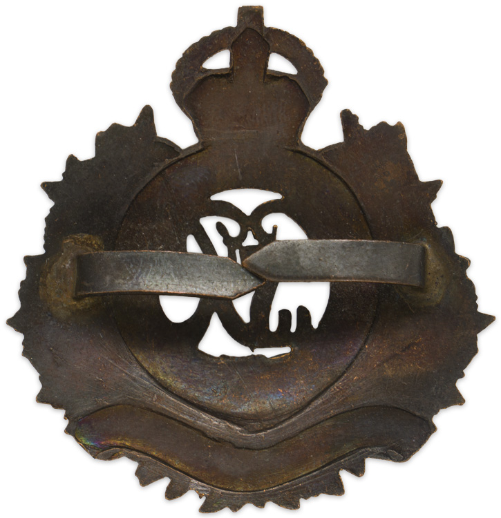 A 4.5cm diameter stamped brass cap badge which features a King’s crown surmounting a stylized belt with "Honi Soit Qui Mal Y Pense" (Evil To Him That Evil Thinks) embossed upon it, the belt encircling the monogram "GR VI," with a wreath of Maple leaves to either side of the crown at the top and a scroll below inscribed with "Royal Canadian Engineers". The reverse features a pair of east/west tangs. Unmarked.