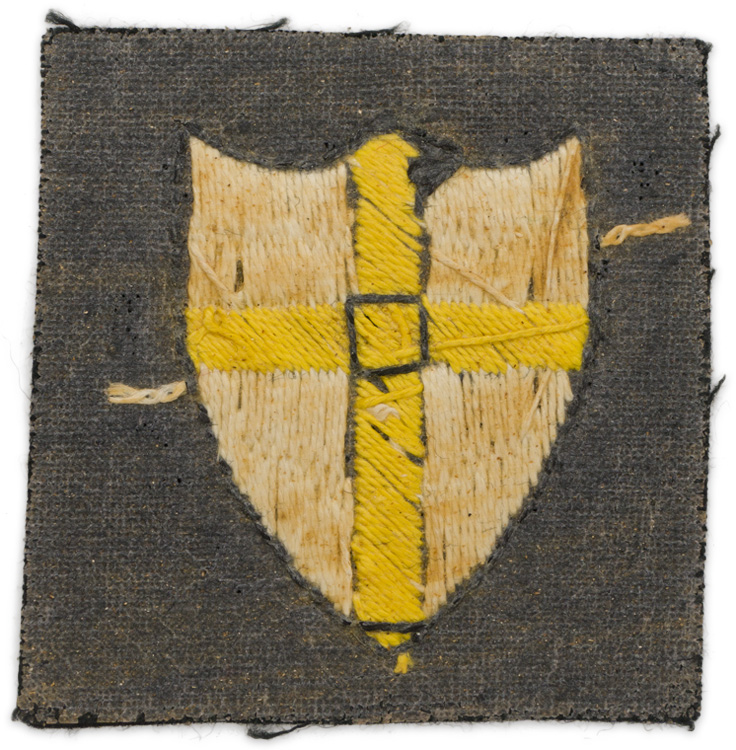 Machine embroidered 5.5cm x 6cm flash has a white stitched shield on a black wool background. A yellow threaded cross is stitched on the shield. Excellent condition.