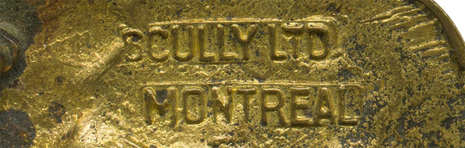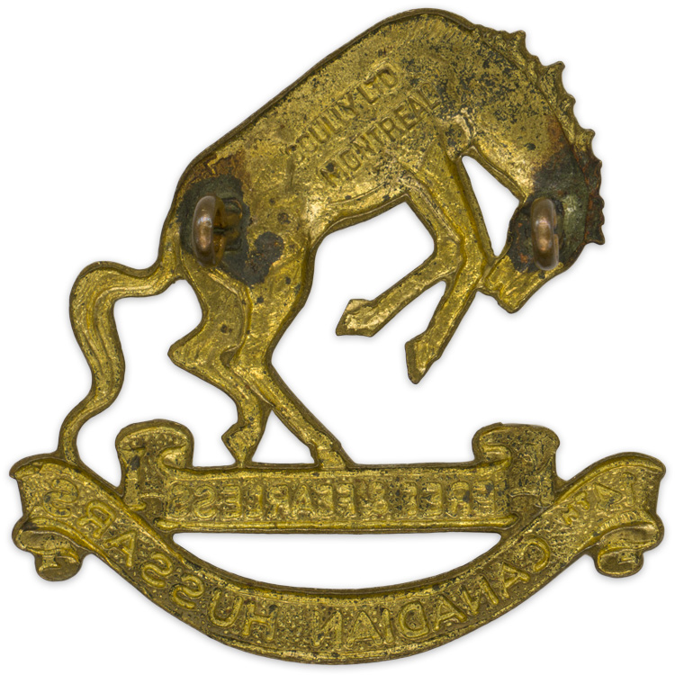 PHYSICAL DESCRIPTION: A stamped brass badge measuring approximately 4.5cm x 4.5cm featuring a "bucking bronco" above two scrolls that are inscribed with the motto "Free and Fearless" and "14th Canadian Hussars" below. Two lugs are present on the reverse that is marked "Scully Ltd. Montreal".